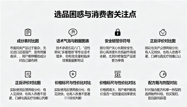 3.部分用戶關(guān)心長(zhǎng)期安全性,擔(dān)心高濃度補(bǔ)充有副作用或依賴,尤其對(duì)修復(fù)型產(chǎn)品更為審慎。