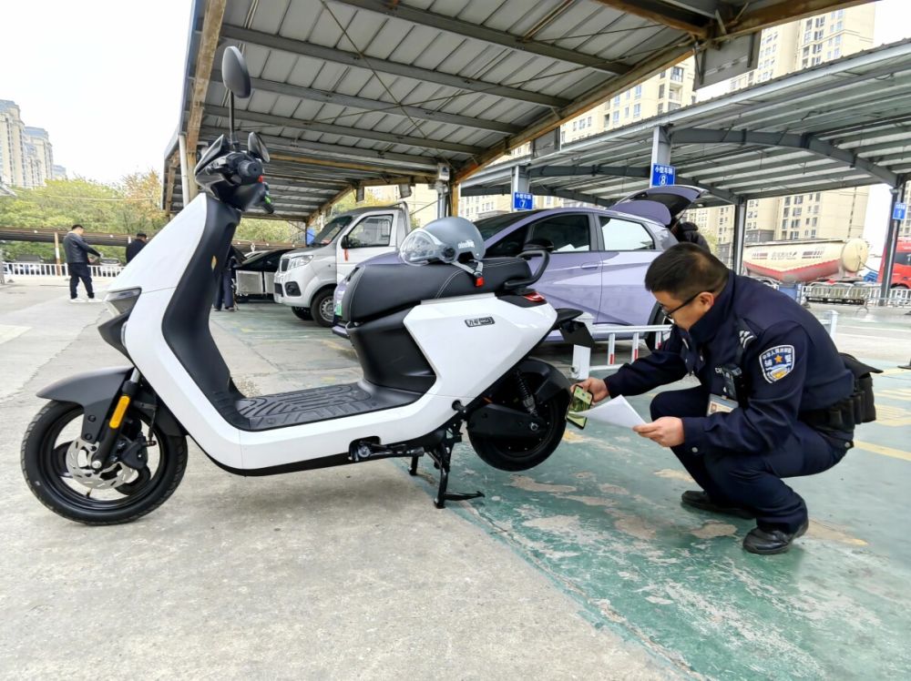 車管所工作人員在為電動摩托車上牌進(jìn)行檢測