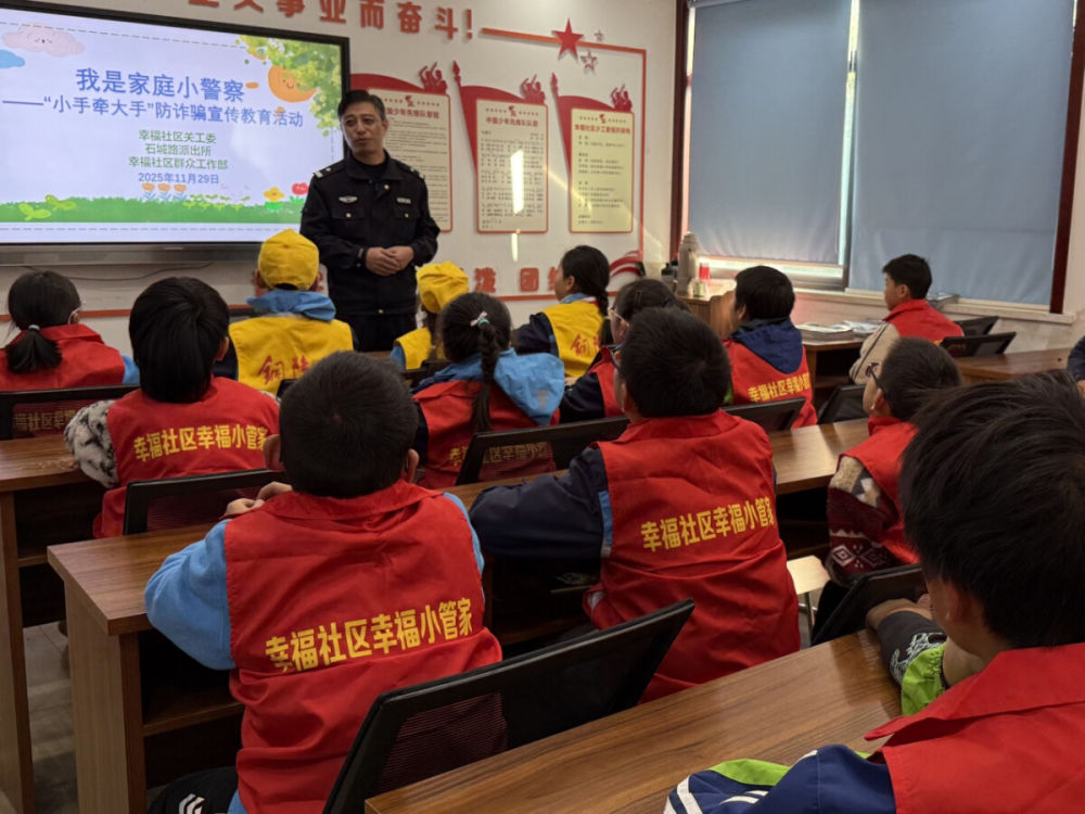 11月29日,幸福社區(qū)開展“幸福小管家——我是家庭小警察”防詐騙宣傳教育活動,師范附屬小學(xué)學(xué)生們認真聆聽防詐騙知識講座,化身“家庭小警察”向社區(qū)居民分發(fā)反詐宣傳單。(幸福社區(qū) 馮浩)