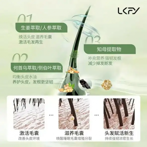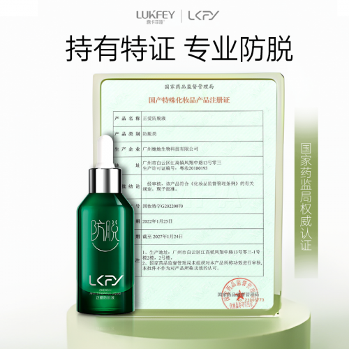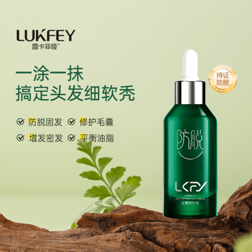 露卡菲婭防脫精華液里面有側(cè)柏葉、人參根、何首烏、當(dāng)歸、牡丹根等幾百種濃縮中草藥萃取精華,中草藥成分+獨(dú)家專利專研生發(fā)因子+進(jìn)口養(yǎng)發(fā)成分,平衡修護(hù)頭皮水油、穩(wěn)固發(fā)根,堅(jiān)持使用可以激活萎縮的毛囊、延長毛囊生長期,強(qiáng)韌發(fā)根,從根源上減少掉發(fā)加固發(fā)絲。止脫養(yǎng)發(fā)改善率達(dá)到 98.7%。