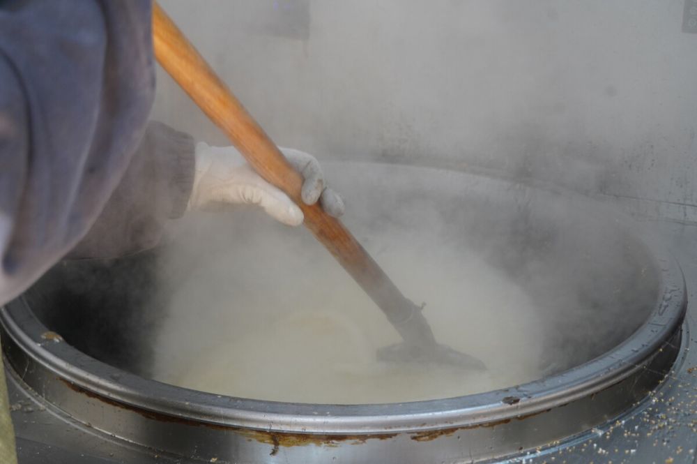 推開花生酥的生產(chǎn)車間大門,暖氣裹挾著甜香撲面而來,香甜愈發(fā)醇厚。一位老師傅站在一口大鍋前,手持長柄鏟勺,在一鍋微微沸騰的金黃色糖漿里有節(jié)奏地攪拌著。糖漿粘稠如蜜,泛著細密的光澤,隨著攪動拉起縷縷琥珀色的絲線。鍋邊立著一支溫度計,他時不時提起溫度計貼近糖漿測試溫度。“熬糖是最關(guān)鍵的一步?!崩蠋煾狄贿厰噭右贿呎f道,“火不能大,大了容易焦糊發(fā)苦;還得不停地攪和,要不糖稀就容易粘鍋底或者給燒糊了,同時糖稀的水份也得控制好,太稀不成型,太稠口感硬”。他的目光始終鎖定鍋中,糖漿咕嘟咕嘟地冒著細密的氣泡,甜香也隨之愈發(fā)濃郁。