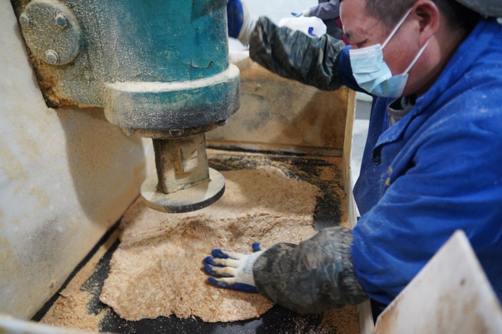 成型的糖團被迅速轉(zhuǎn)移到一旁的操作臺上,裹上一層細膩的花生粉后,一分為二,送入錘機之下進行反復(fù)捶打。機器規(guī)律地起落,發(fā)出沉穩(wěn)的“咚咚”聲。一位師傅守在旁邊,時不時伸手調(diào)整糖塊的位置與角度,確保每一處都被均勻捶打。