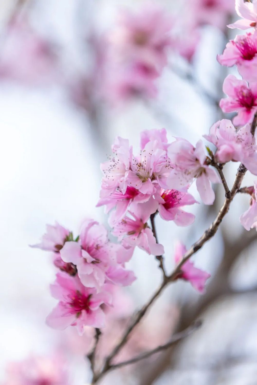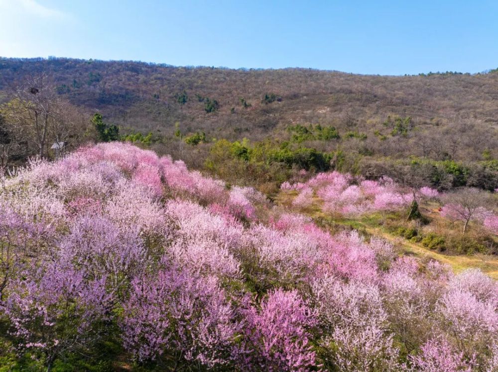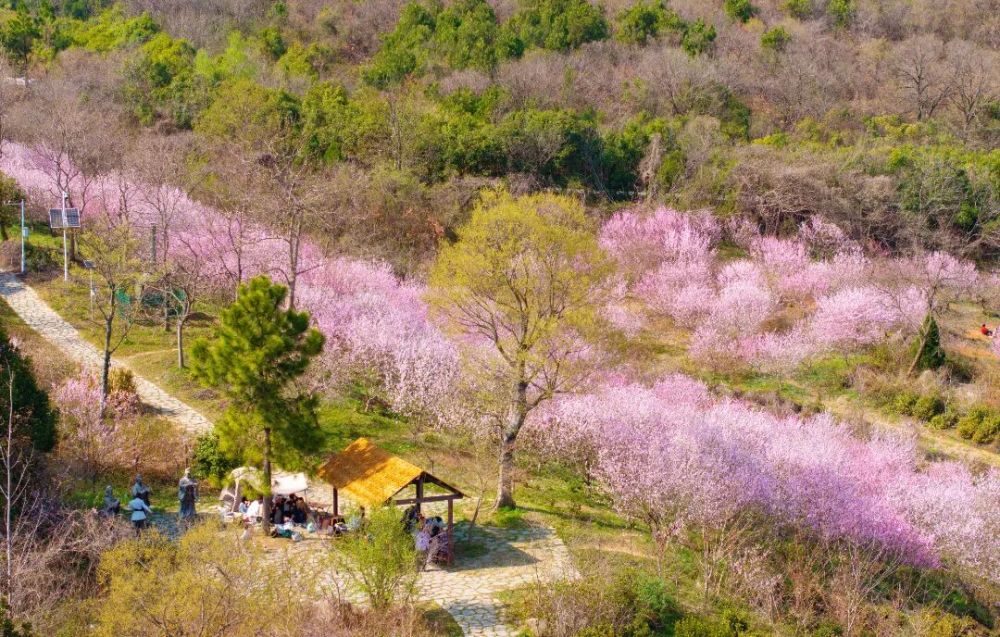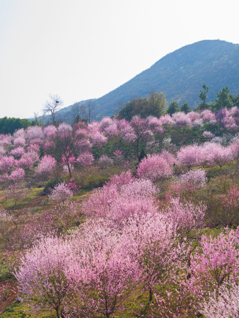 春日的暖陽穿過樹梢,灑在小徑上,忽明忽暗的光影斑駁了一地。踩上去沙沙響,走幾步,一抬頭,整片桃園就攤在眼前了。整座山谷都被染了色,一層一層的粉色鋪陳開去,與遠(yuǎn)山的青綠連成一片。