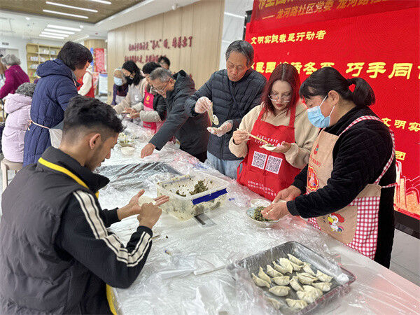 活動現(xiàn)場,志愿者提前準(zhǔn)備好了食材工具。大家分工協(xié)作,揉面、搟皮、調(diào)餡、包餃,動作嫻熟,配合默契。居民朋友們一邊包餃子,一邊交流生活趣事與節(jié)氣習(xí)俗,現(xiàn)場氣氛溫馨熱烈。兩位來自安徽大學(xué)的留學(xué)生也興致勃勃加入其中。在居民指導(dǎo)下,他們從生疏到逐漸熟練,包出的餃子形態(tài)各異卻充滿趣味。“第一次包餃子,非常有趣,感受到了中國傳統(tǒng)習(xí)俗的熱鬧氛圍?!蓖鈬讶擞弥形谋磉_(dá)喜悅,并與大家分享了本國的特色習(xí)俗,中外文化在交流中碰撞出別樣火花。