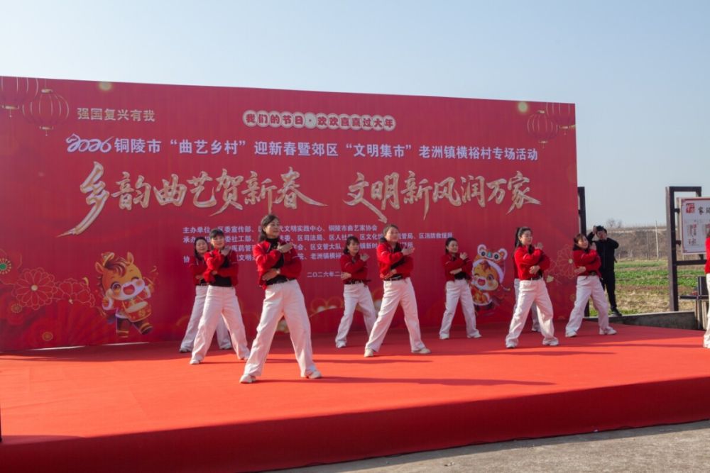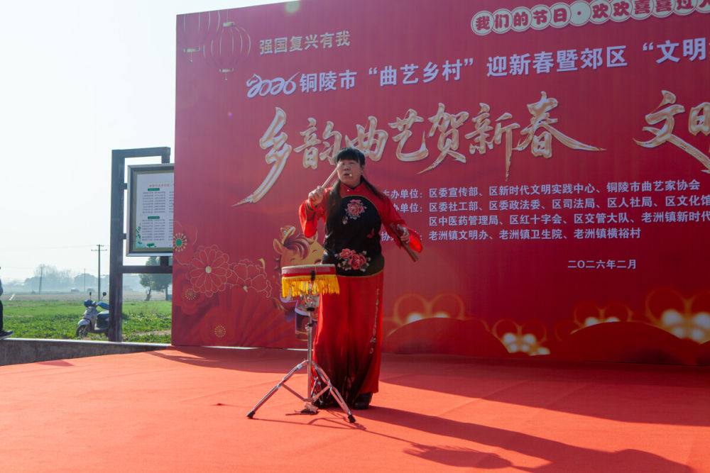 為營造歡樂祥和的新春氛圍,展現(xiàn)鄉(xiāng)村振興豐碩成果,2月4日上午,“我們的節(jié)日——歡歡喜喜過大年”2026年銅陵市“曲藝鄉(xiāng)村”迎新春暨郊區(qū)“文明集市”老洲鎮(zhèn)橫裕村專場活動在橫裕村新時代文明實踐廣場精彩啟幕。本次活動以“鄉(xiāng)韻曲藝賀新春 文明新風潤萬家”為主題,將曲藝表演與便民服務深度融合,為村民們送上了一場接地氣、有韻味的文化惠民盛宴。