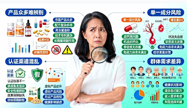 2.單一維生素D3或鈣成分產(chǎn)品易導(dǎo)致血鈣高、鈣流失至血管或軟組織,無法解決骨密度和免疫力多重訴求,部分消費(fèi)者反映補(bǔ)充后癥狀無改善甚至更差。